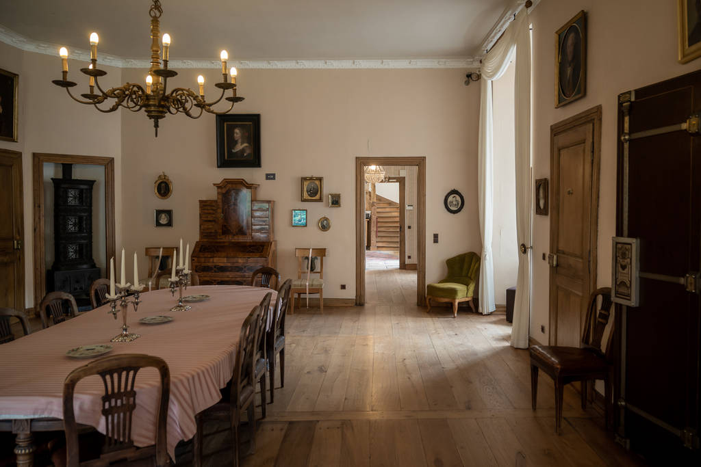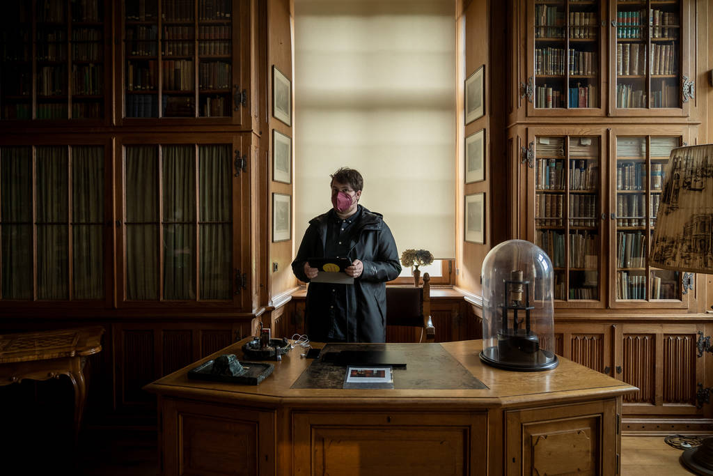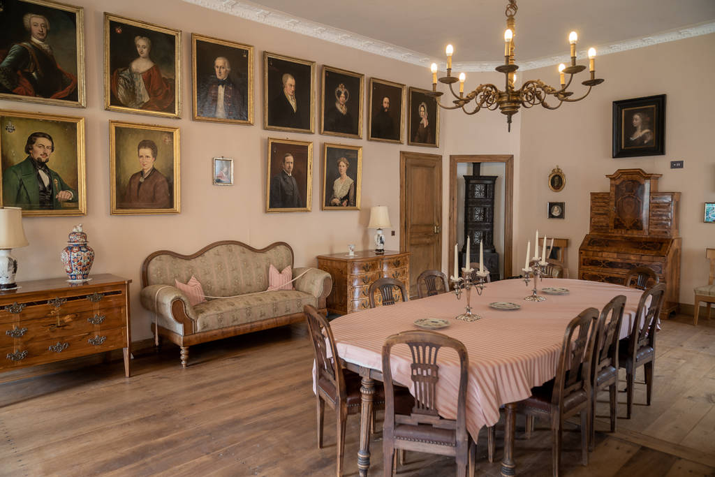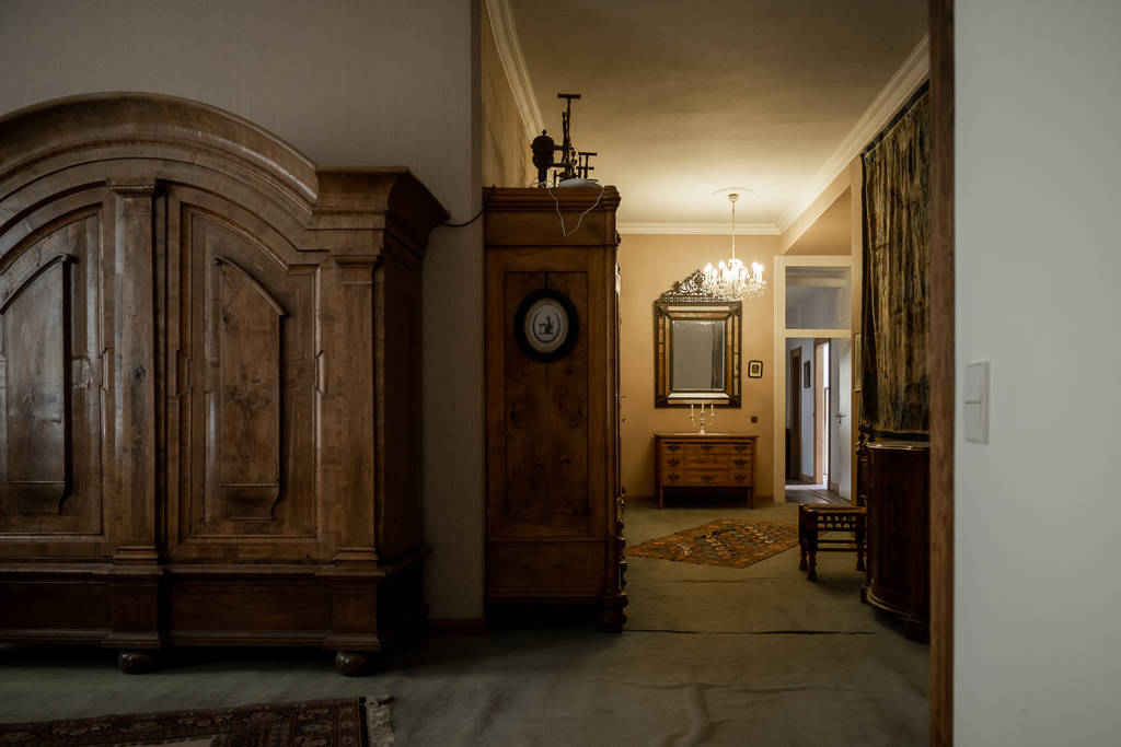 In der Bibliothek der massive Schreibtisch, die unzähligen Bücher hinter Glasscheiben geschützt. Die Bildergalerie, bepolsterte Stühle, Kerzenständer, das Porzellan im Ahnenzimmer.