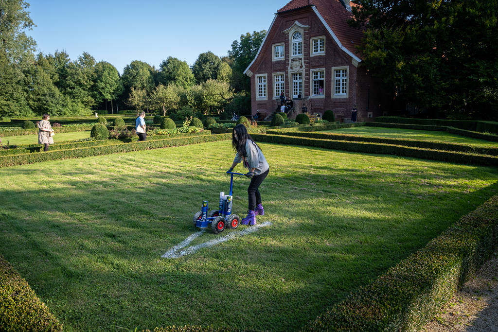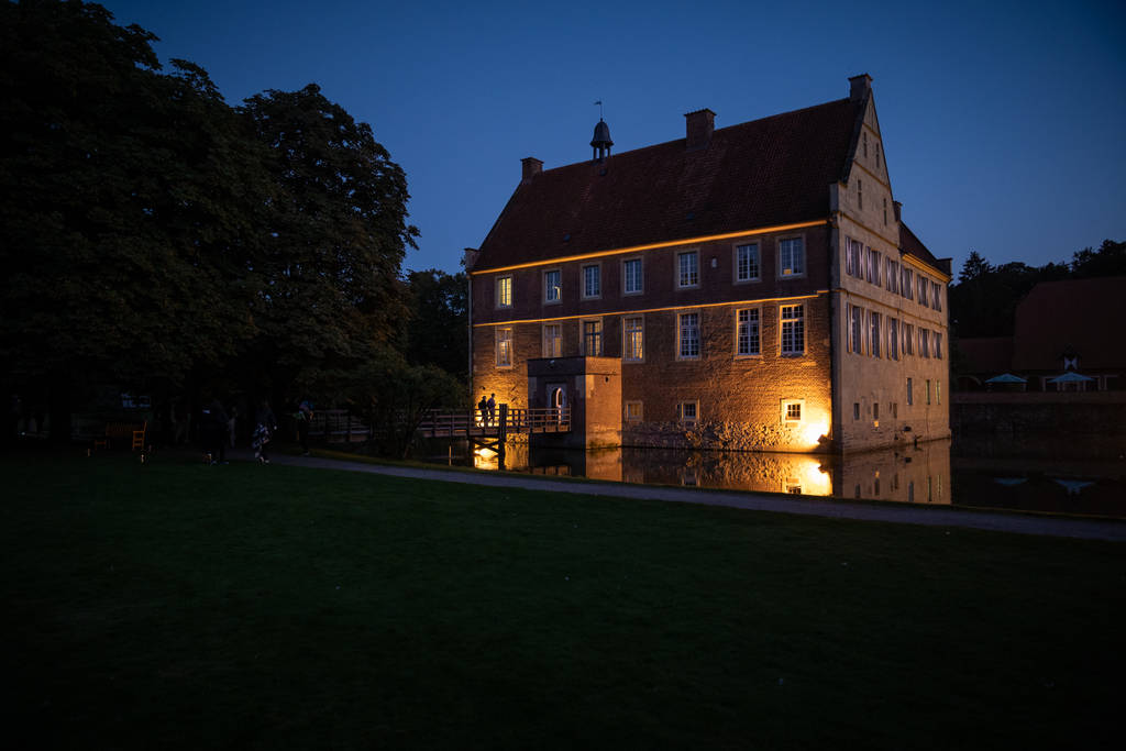 In der mittelalterlichen Vorburg zum Beispiel, die früher als Stallung genutzt wurde und heute mit nicht viel mehr als einer mobilen Bühne und Traversen für Scheinwerfer ausgestattet ist, wird dann eine Drag Show gefilmt. Vom Teehaus, das zart und still am Ende einer Allee gelegen ist, wummsen bei Festivals DJ-Bässe durch den 30 Hektar großen Park. Und eine Schriftstellerin wie Karen Duve und die Sängerin Bettina Bruns laden zum wortreichen Wanderritt durchs Pferdeland Westfalen.