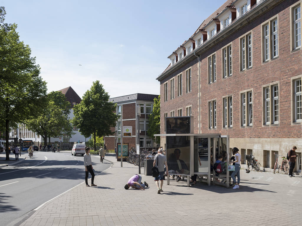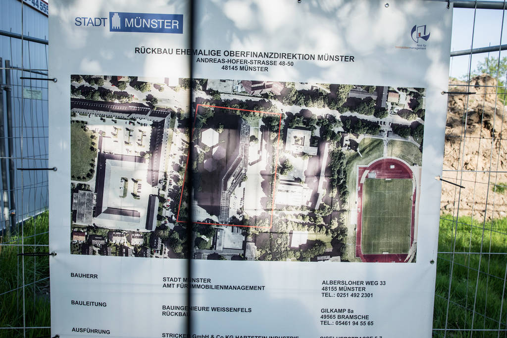 Keiner wohl hat sich eingehender mit dem Schauplatz Münster beschäftigt als Christian Odzuck. Über viele Monate war der Künstler unterwegs in der Stadt. Seine Wahl fiel schließlich auf diesen Ort für sein Projekt: Hier streckte sich vor kurzem noch ein 150 Meter langer Gebäuderiegel aus – die Oberfinanzdirektion. Bei seinen Stadterkundungen sei ihm der 60er-Jahre-Bau sofort aufgefallen, so Odzuck.