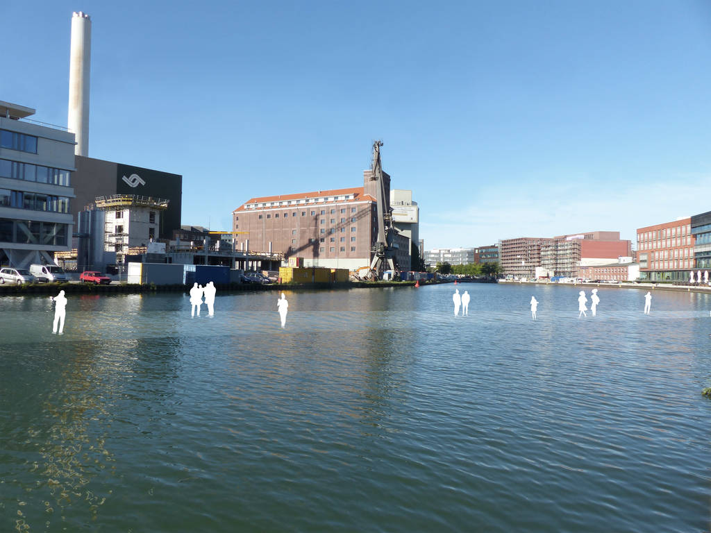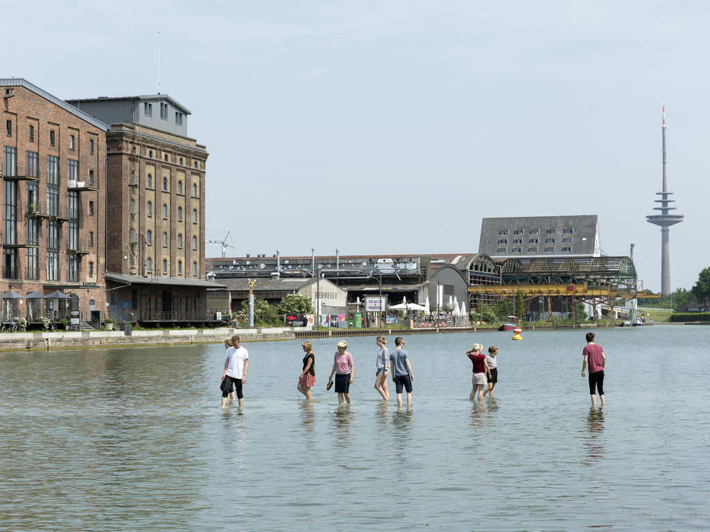 Der Ort und die Zeit sind auch entscheidend für Ayşe Erkmen und ihre Kunst, die fast immer für den einen Schauplatz gemacht und so gut wie nie auf Dauer gedacht ist. In Münster hat die Künstlerin aus Istanbul (Jg. 1949) einen Unterwasser-Steg bauen lassen, auf dem der Besucher nassen Fußes das Hafenbecken queren kann. Die Bilder der wundersamen Wasserwanderungen im Hafen haben gewiss das Zeug, zum Markenzeichen dieser Skulptur Projekte zu werden.