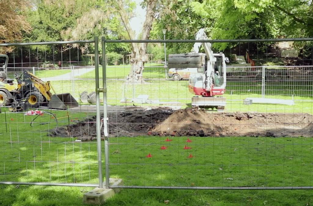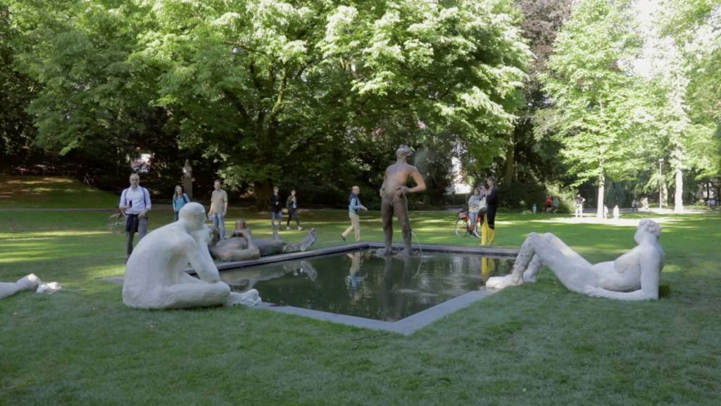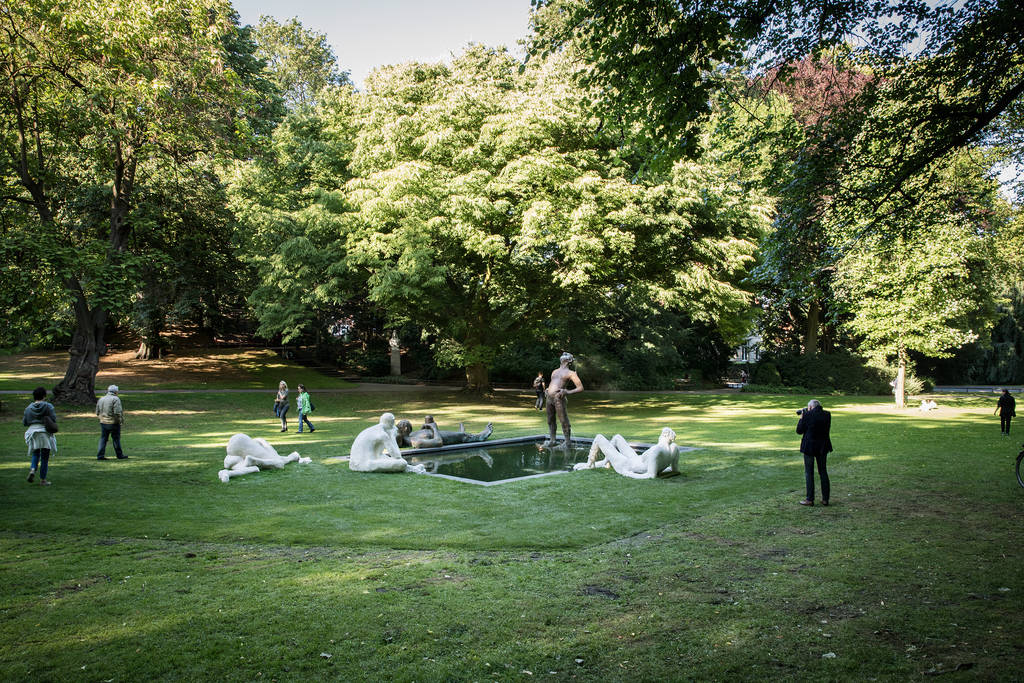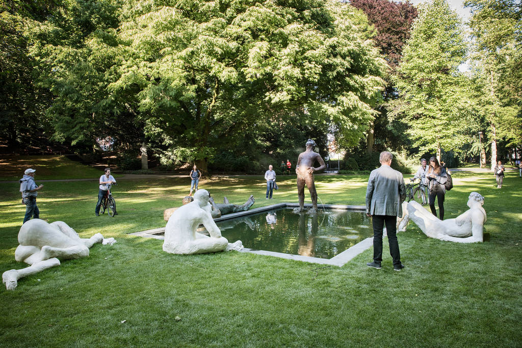 Kaum zu übersehen ist Nicole Eisenmans leicht entgleiste Gesellschaft im Park am Buddenturm. Auf der Wiese lungern sie um einen Pool herum: schwerfällig, die Dose Bier in der Hand. Drei der fünf überdimensionierten Typen sind aus Gips, der schon im Juni erste Auflösungserscheinungen zeigt. Zwei wurden in Bronze gegossen, scheinen sich aber geradezu aufzulehnen gegen die Erhabenheit, die man einem klassischen Denkmal dieser Machart für gewöhnlich zuschreibt. Spannend scheint, wie Eisenman mit ihrer bizarren Inszenierung auf den Ort reagiert – die alltägliche Park-Situation vielleicht sogar karikiert.