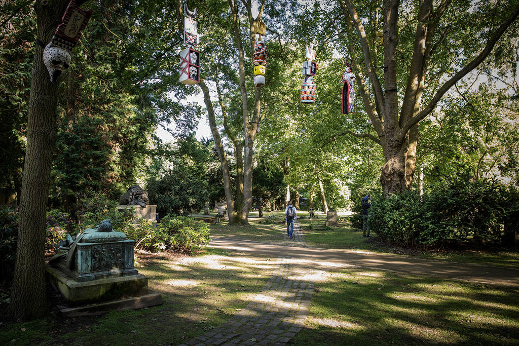 Den stillgelegten Überwasserfriedhof hat Hervé Youmbi sich ausgeguckt und bunte Masken hoch oben in die Bäume gehängt. Eigens angefertigt in Werkstätten in Kamerun, zitieren sie einen amerikanischen Horrorfilm und alte Totenkulte aus Afrika. Auf der christlichen Begräbnisstätte bieten sie reichlich Anlass über mögliche Berührungspunkte von Pop-Kultur, Religion und Aberglaube nachzudenken.