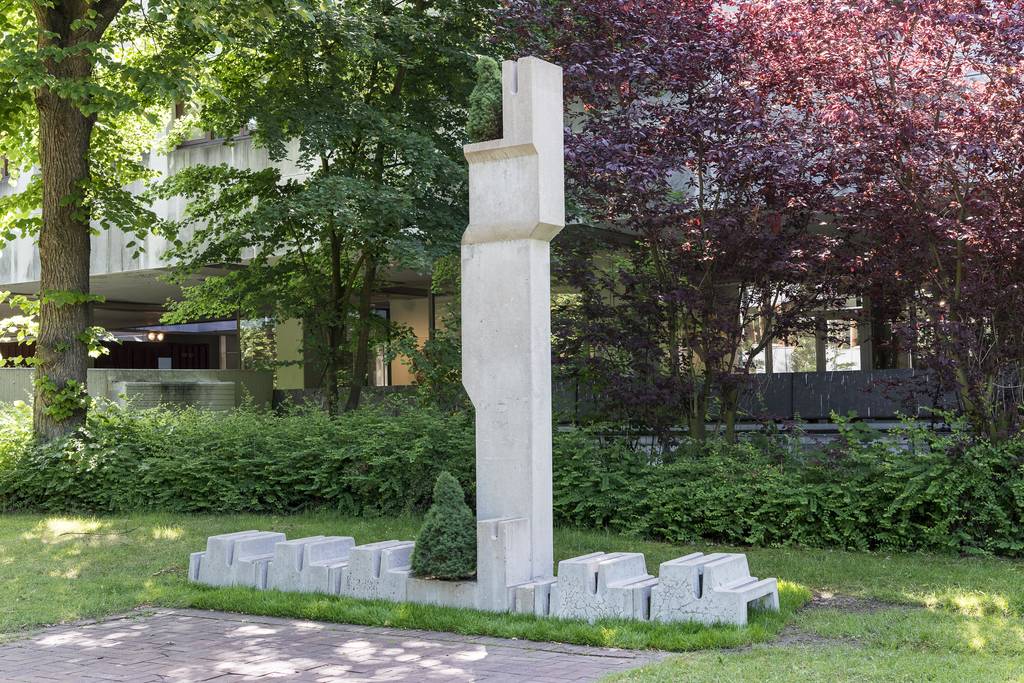 Odzuck hat auf die Brache in Münster eine begehbare Skulptur gebaut, die Elemente der ursprünglichen Eingangsarchitektur der Oberfinanzdirektion aufgreift und verwandelt. Ein Pylon gehört dazu und eine umlaufende Treppe, außerdem eine erhöhte Plattform und darauf eine alte Straßenlaterne.