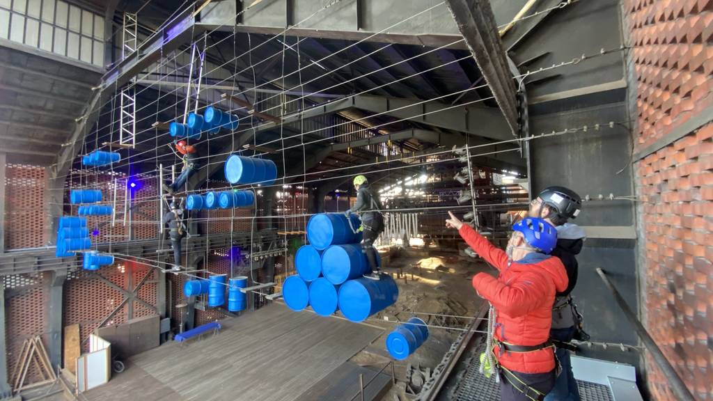 In der ehemaligen Gießhalle geht es aber immer noch heiß her: Der Weg führt über mehrere Hindernis-Ebenen. Sie erinnern an einen Konsolenspiel-Klassiker aus den 80er-Jahren. Der Affe Donkey Kong schmeißt darin Fässer nach der Spielfigur Mario. Dieses Game hatten die Konstrukteure vor Augen, als sie den Abschnitt im Kletterpark anlegten. Der Nachbau passt – glücklicherweise ohne Fässerwurf.