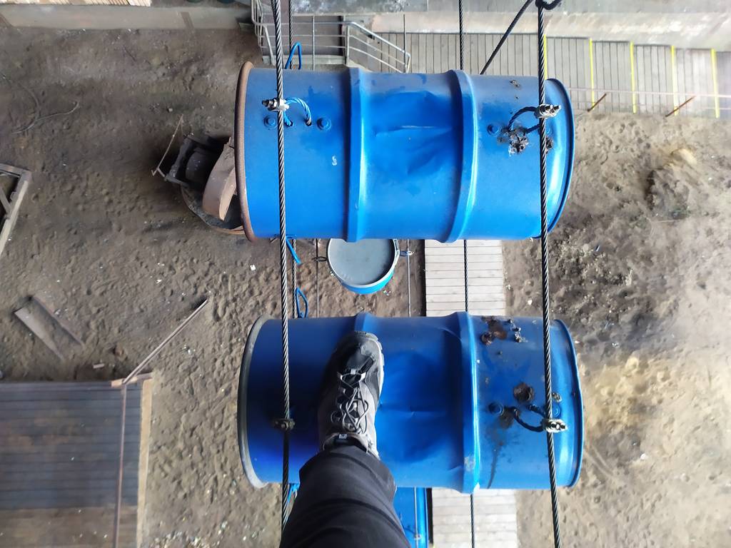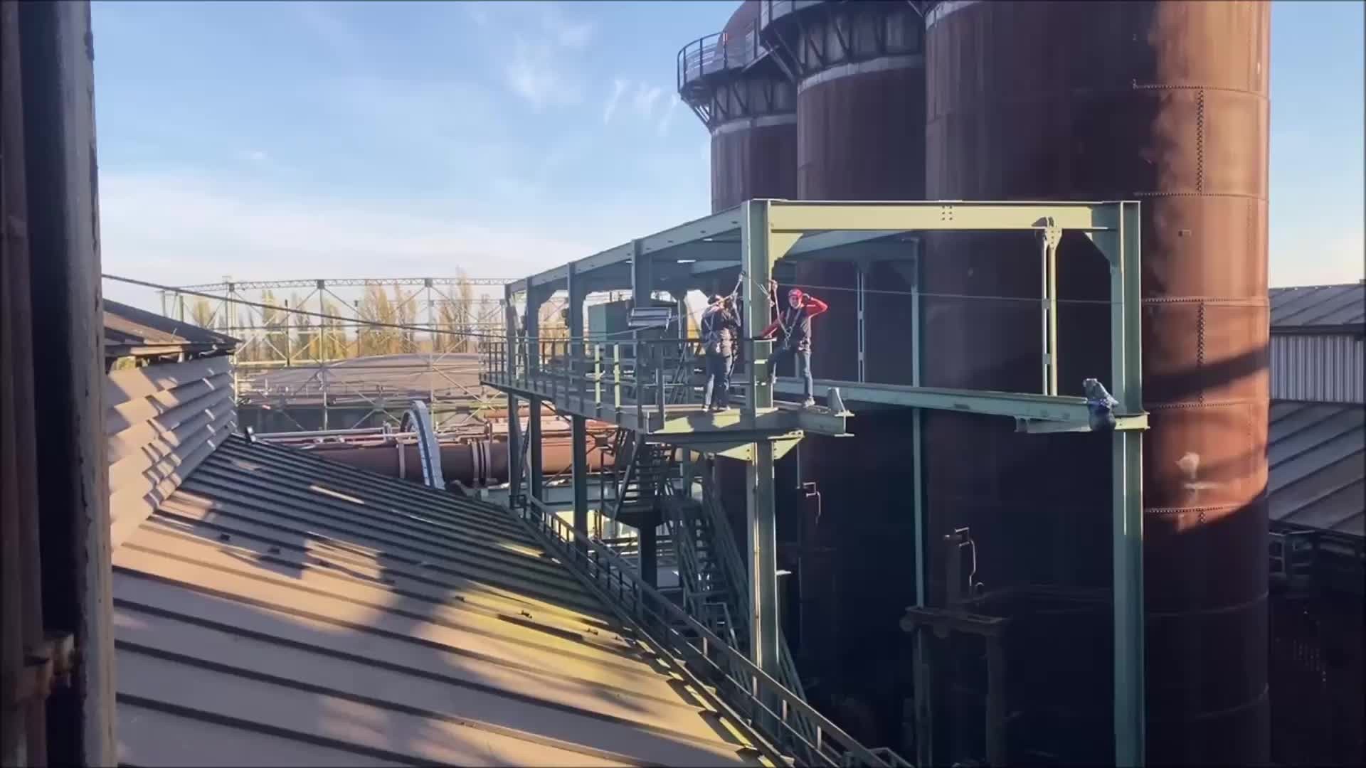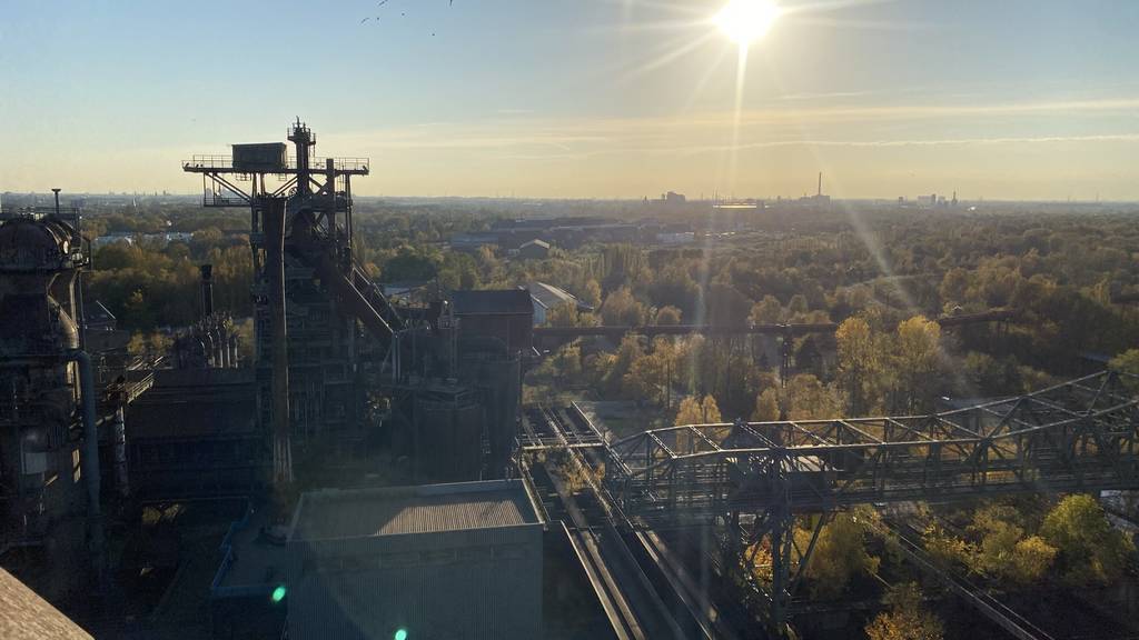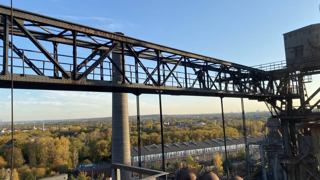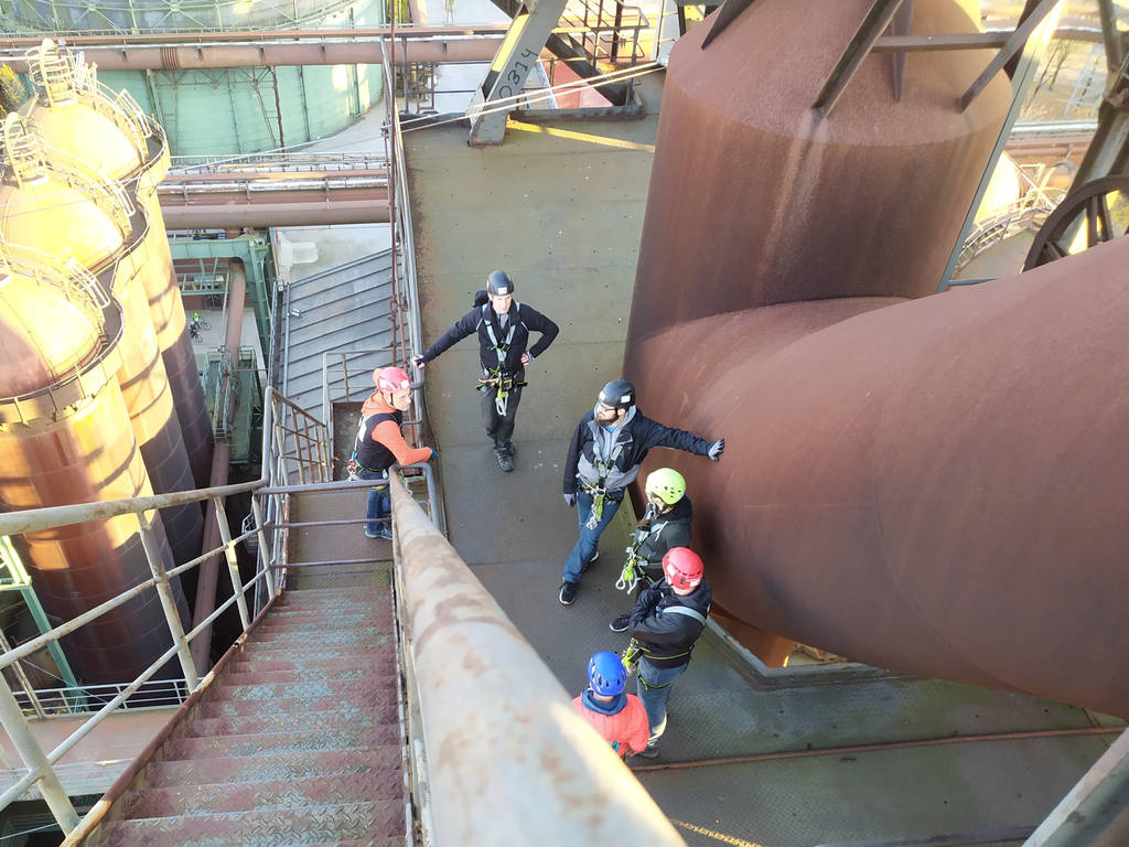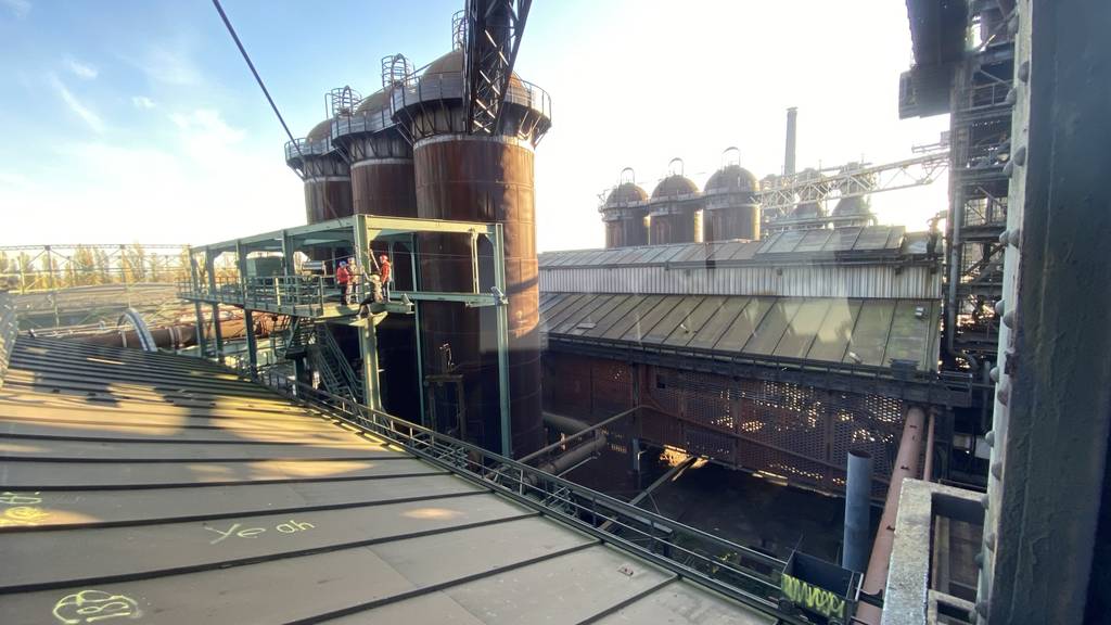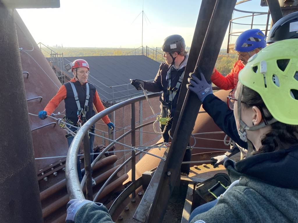 Oben angekommen pumpt das Adrenalin – allerdings nur bei den Neulingen. Hobbykletterer Stephan ist die Ruhe selbst, reflektiert die Tour auf Stahlträgern im gemütlichen Liegesitz. Warum wohl die massiven Stahlgriffe nicht auf der Röhre, sondern seitlich angebracht waren? Sicher sind die schon am Boden an die Röhre geschweißt worden, nicht hier in der Höhe, mutmaßt die Crew. Dass sich hier oben mal Freizeitkletter*innen entlanghangeln würden, haben die Schwerstarbeiter beim Bau des Hochofens 2 im Jahr 1963 wohl nicht geahnt.