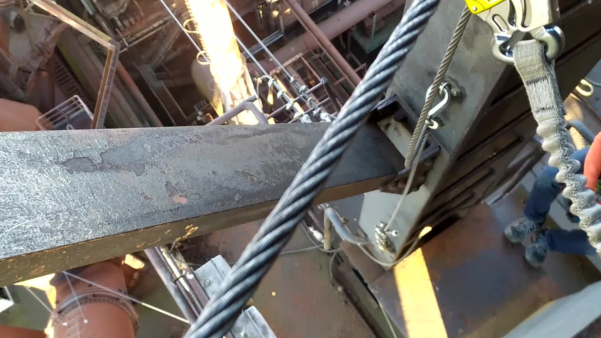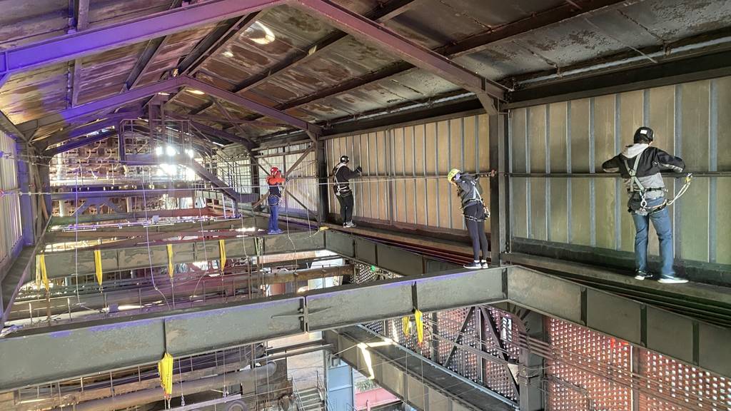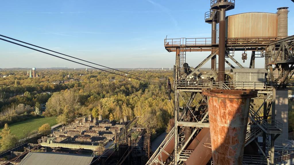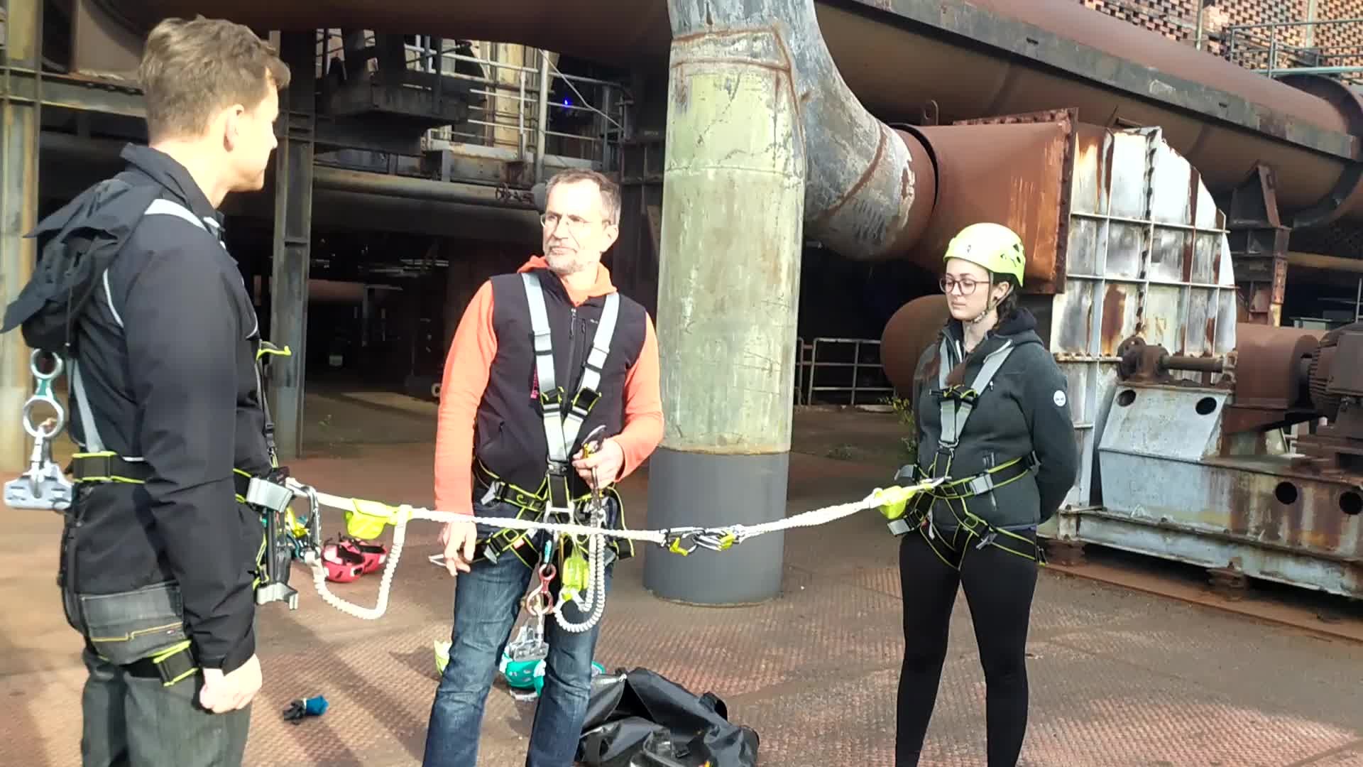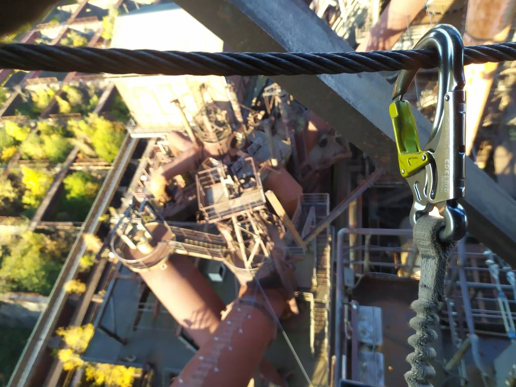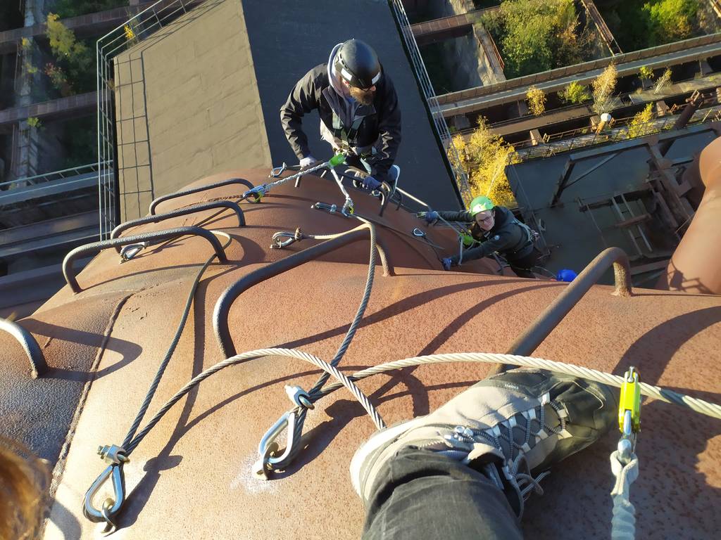 32 Meter Strecke gilt es auf dem Seil zu überwinden. Es verbindet die Spitzen von Hochofen 2 mit Hochofen 1. Gedanken hüpfen durch den Kopf: Uff! Nein! Warum auch? Auf keinen Fall! „Ihr müsst das nicht machen“, so die Guides. Und doch. Alle wollen. Die Karabiner hängen. Die Erfahrung lockt.