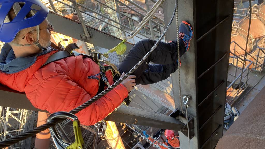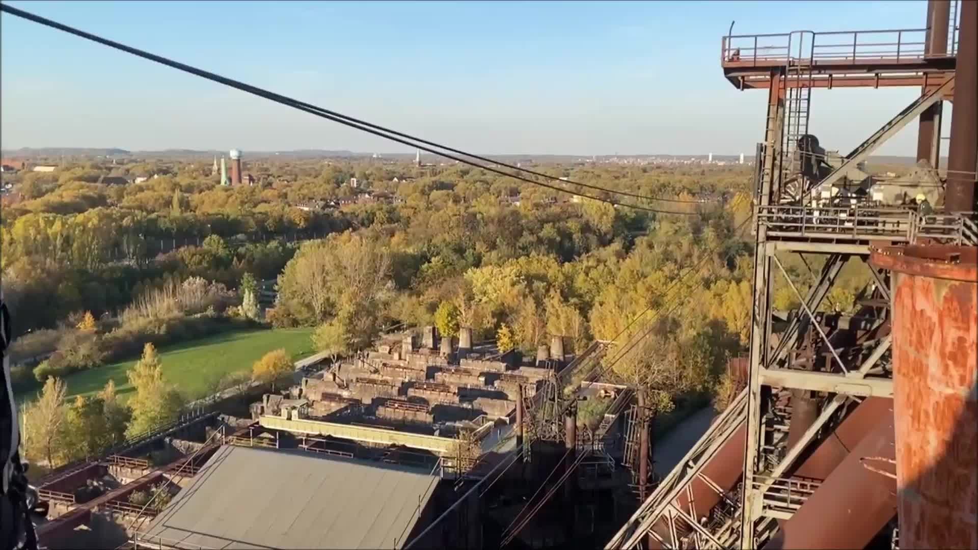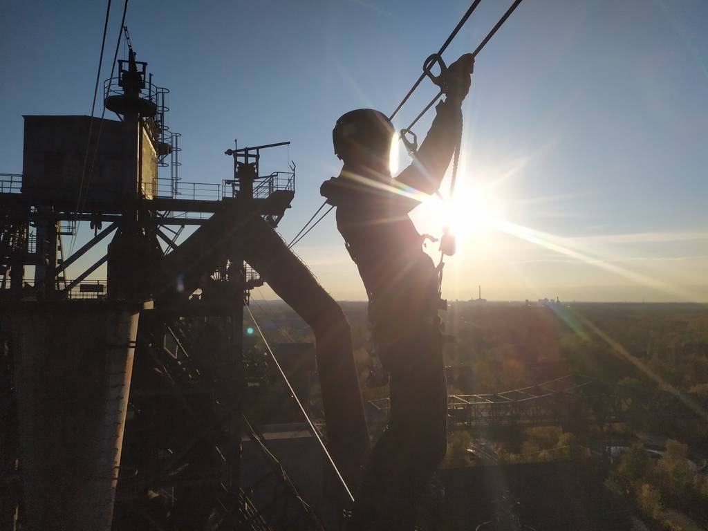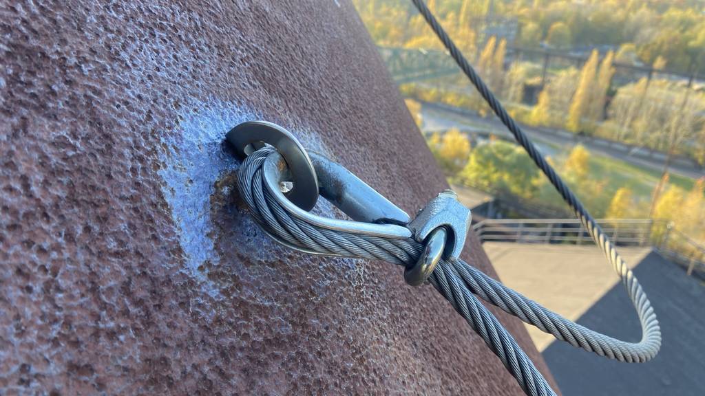 Heute hängen wir an dieser Röhre, fast an der Spitze der Anlage, in mehr als 50 Metern Höhe. Thomas und Detlef haben nicht zu viel versprochen: Anstrengung, Adrenalin und eine atemberaubende Aussicht. Eine schräge Röhre zu erklimmen, ist gar nicht so einfach wie es von unten scheint: Langsam heben sich die Füße. Karabiner einhaken, zwei Schritte, Karabiner nachholen, einhaken. Der Atem stockt. Die nächste Plattform ist nicht mehr weit…