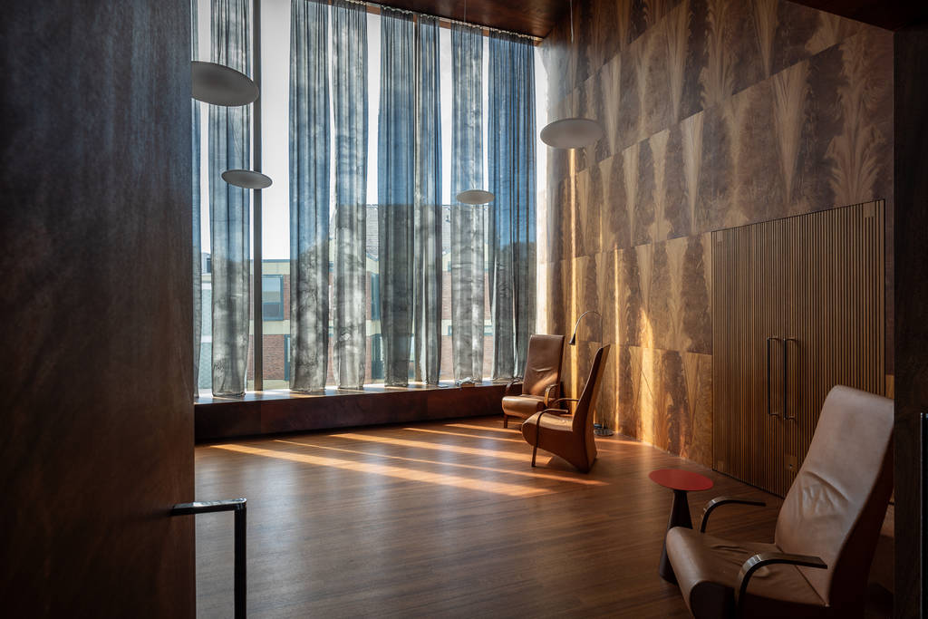 Die Ruhe nach dem Tanz: Auch die Pausen finden einen passenden Raum. Im Lesezimmer sitzt jedes Detail. Mit seinen Ledersesseln, der edlen Holzverkleidung und den grau bis schwarz schattierten Seidenbahnen vor den Fenstern wirkt es durchaus wohnlich.