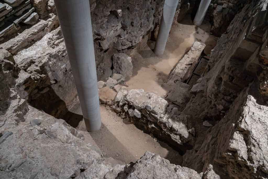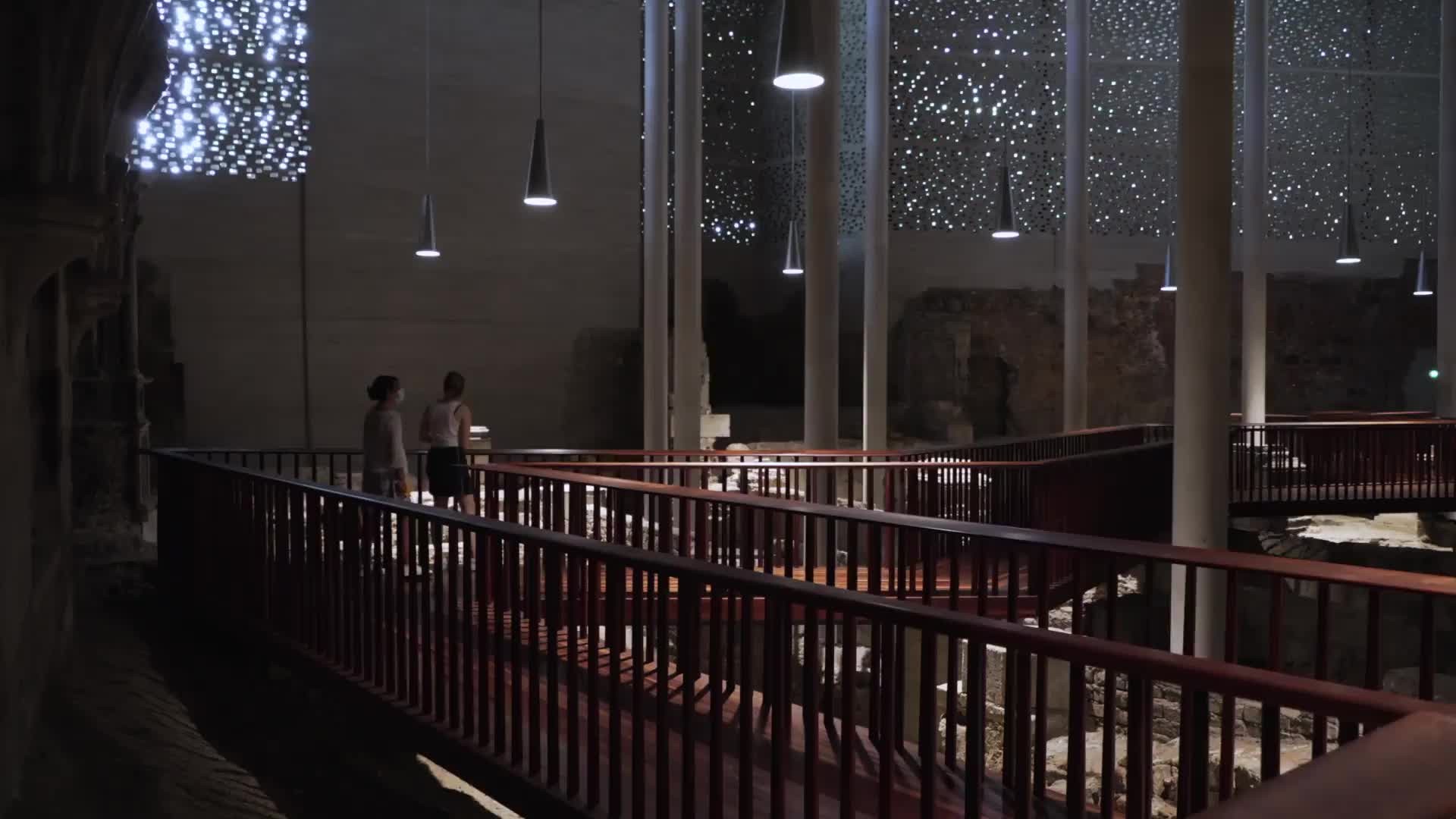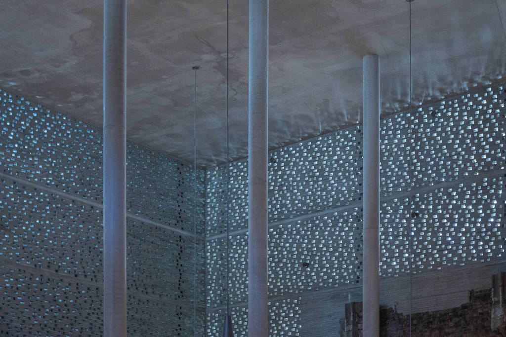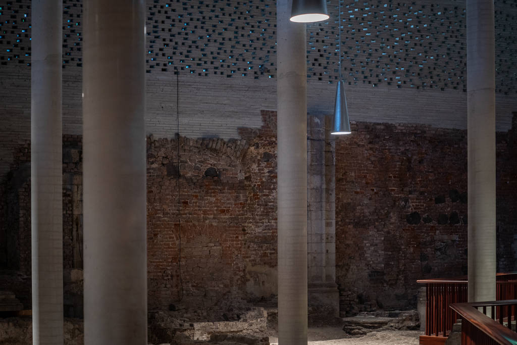 Im Zickzack führt der Weg über einen hölzernen Steg. Vorbei an schlanken Stützen, die emporragen aus den Mauerresten. Der Blick hinab fällt auf archäologische Zeugnisse aus zwei Jahrtausenden. Und hinauf schaut man dem feinen Lichtmosaik der durchlöcherten Backsteinmauern entgegen.