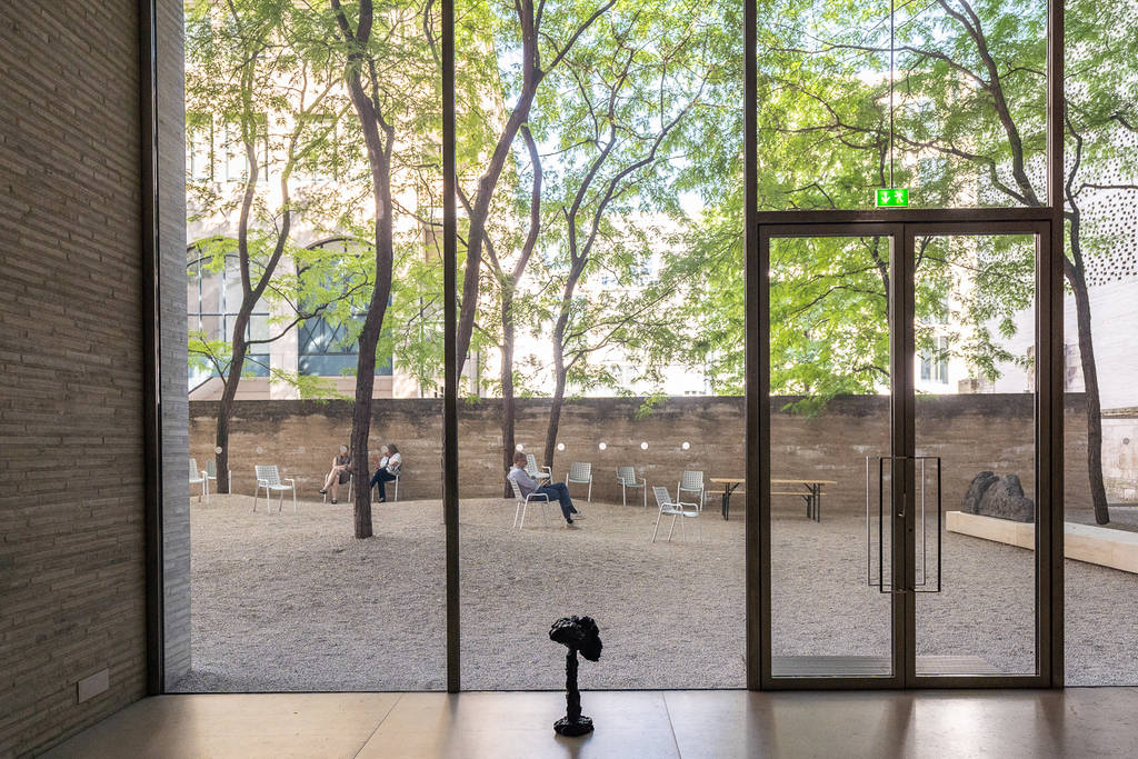 Auch draußen pausiert man stilvoll: Peter Zumthor setzte sein ummauertes Gärtlein an die Stelle eines alten Friedhofs und bepflanzte es mit elf Christusdornbäumen.