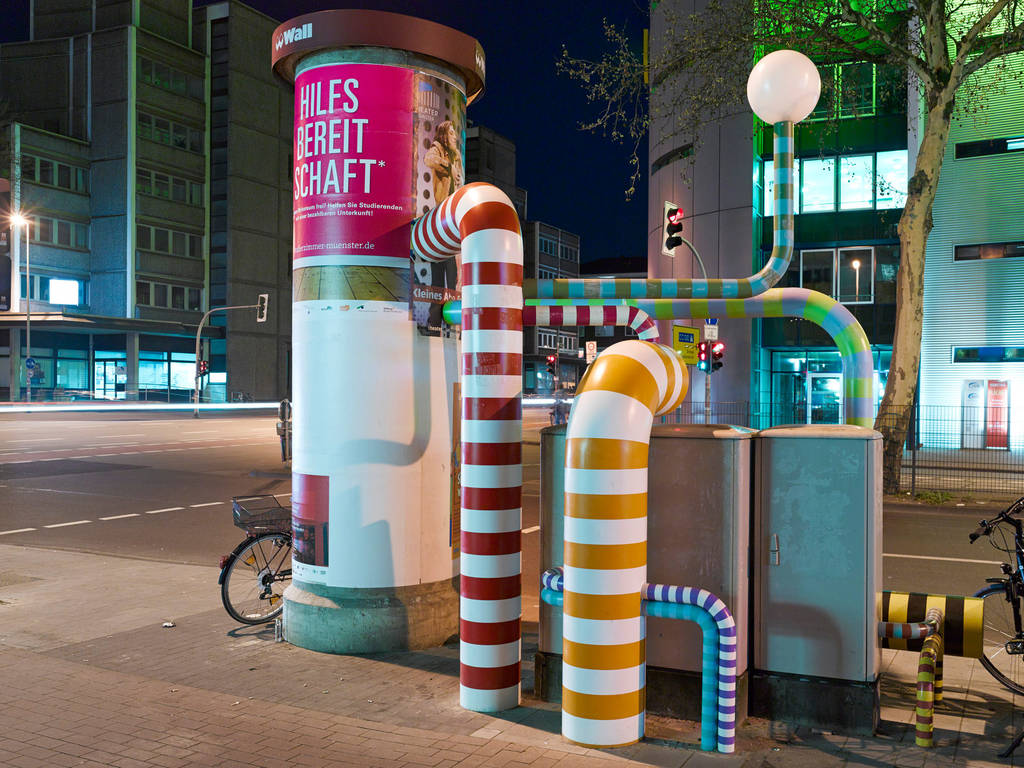 Der Mond ist aufgegangen – und trotzdem hat Tobias Rehbergers künstlerische Variante nichts mit Matthias Claudius` frommer Dichtung gemein. Stattdessen ist The Moon in Alabama eine Art dezentrale Weltzeituhr: Elf runde Lichtkugeln leuchten als Monde seit 2014 über Schaltschränken im öffentlichen Raum rund um den Hauptbahnhof. Sie sind jeweils einem Ort von Tokyo über Ibiza bis Wanne-Eickel gewidmet. Wenn dort der Mond scheint, geht auch in Münster ein Licht an.