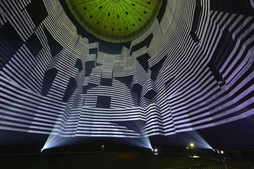 Ein ganzer Gasometer erfüllt von Licht: Die Video-Mapping-Installation „320° Licht“ von URBANSCREEN ist das Highlight der Ausstellung "Der schöne Schein" in Oberhausen.