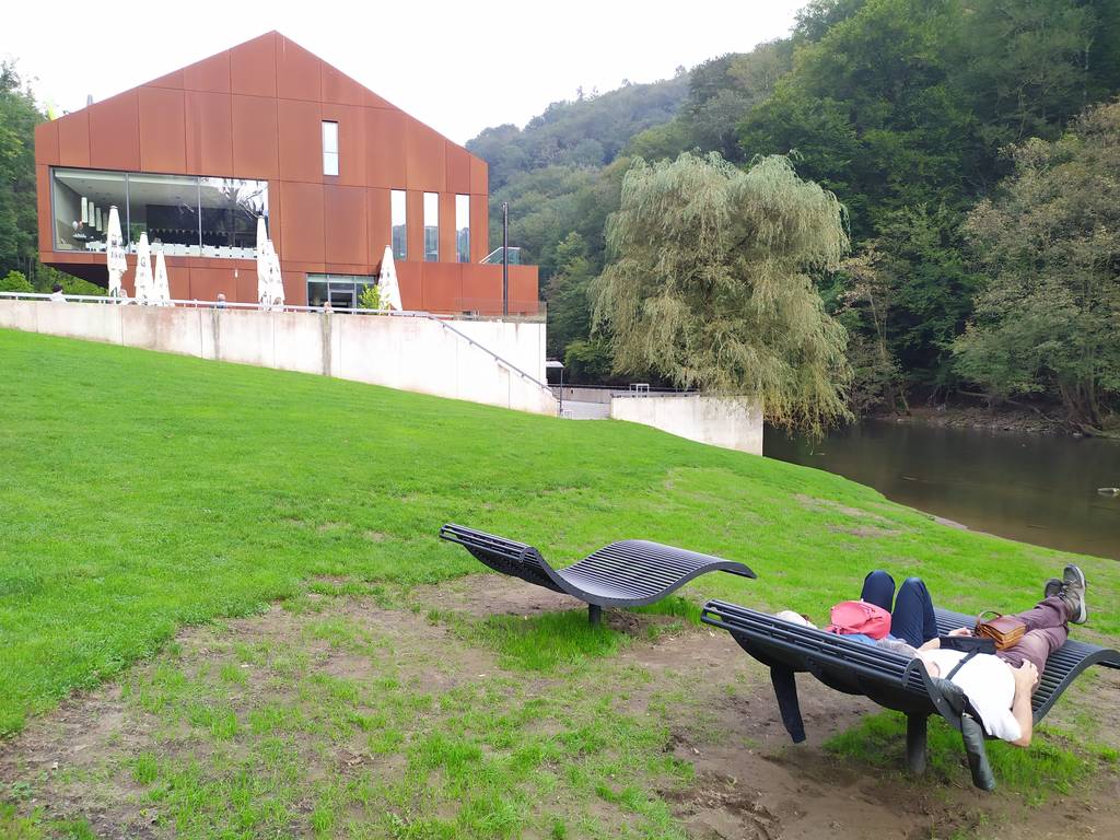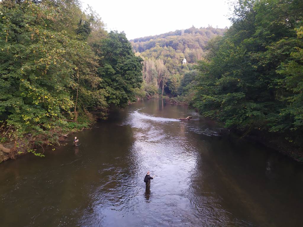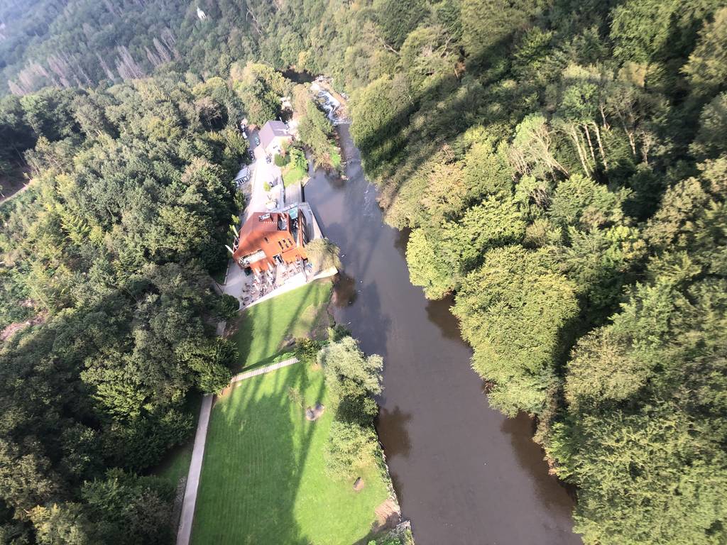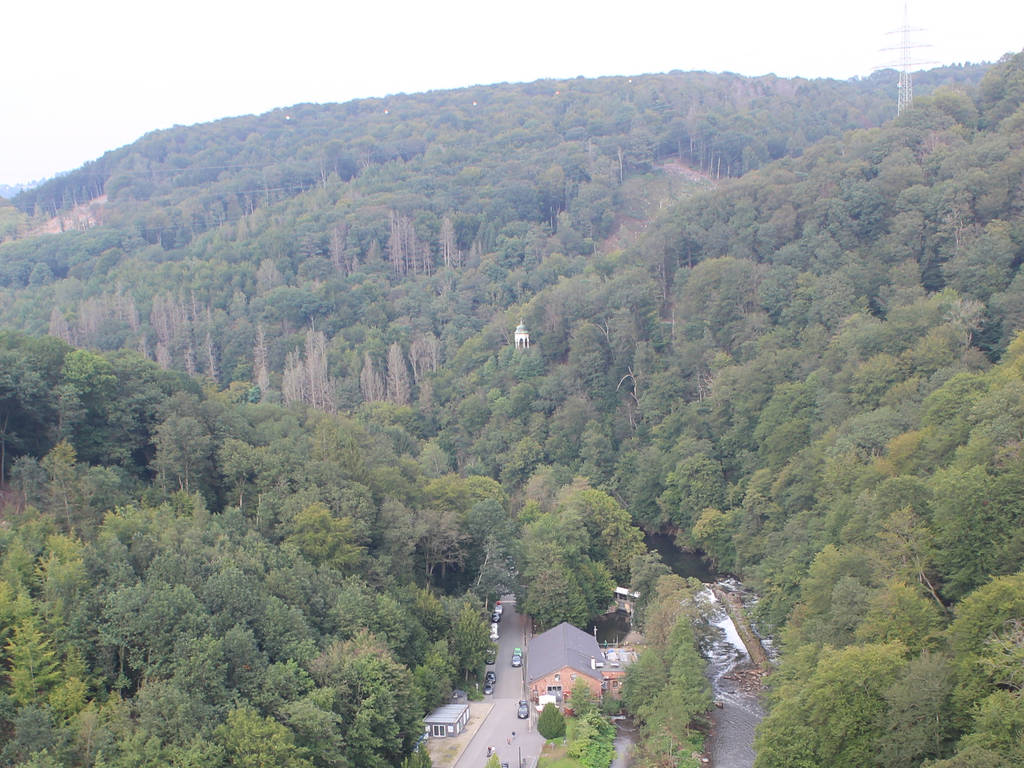 Die Anspannung wird ab und an nur durch kleine Pausen unterbrochen, in denen der Blick mal zurück, mal auf die wunderbare Landschaft des Müngstener Brückenparks fällt. Haus Müngsten ist mit seiner braunen Stahlfassade und den großen Fensterfronten nur noch ein kleiner Fleck im Grün. Unten fließt ruhig die Wupper. Bäume ragen aus den Hängen empor. Die Brückenschatten überdeckt die Auenlandschaft.