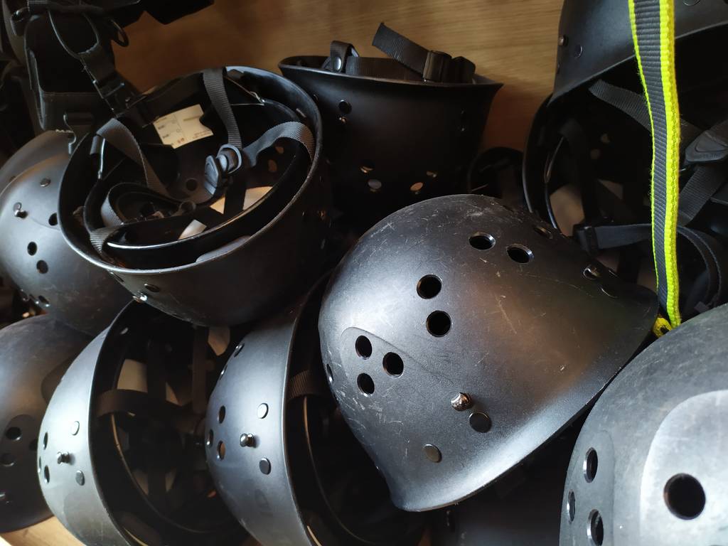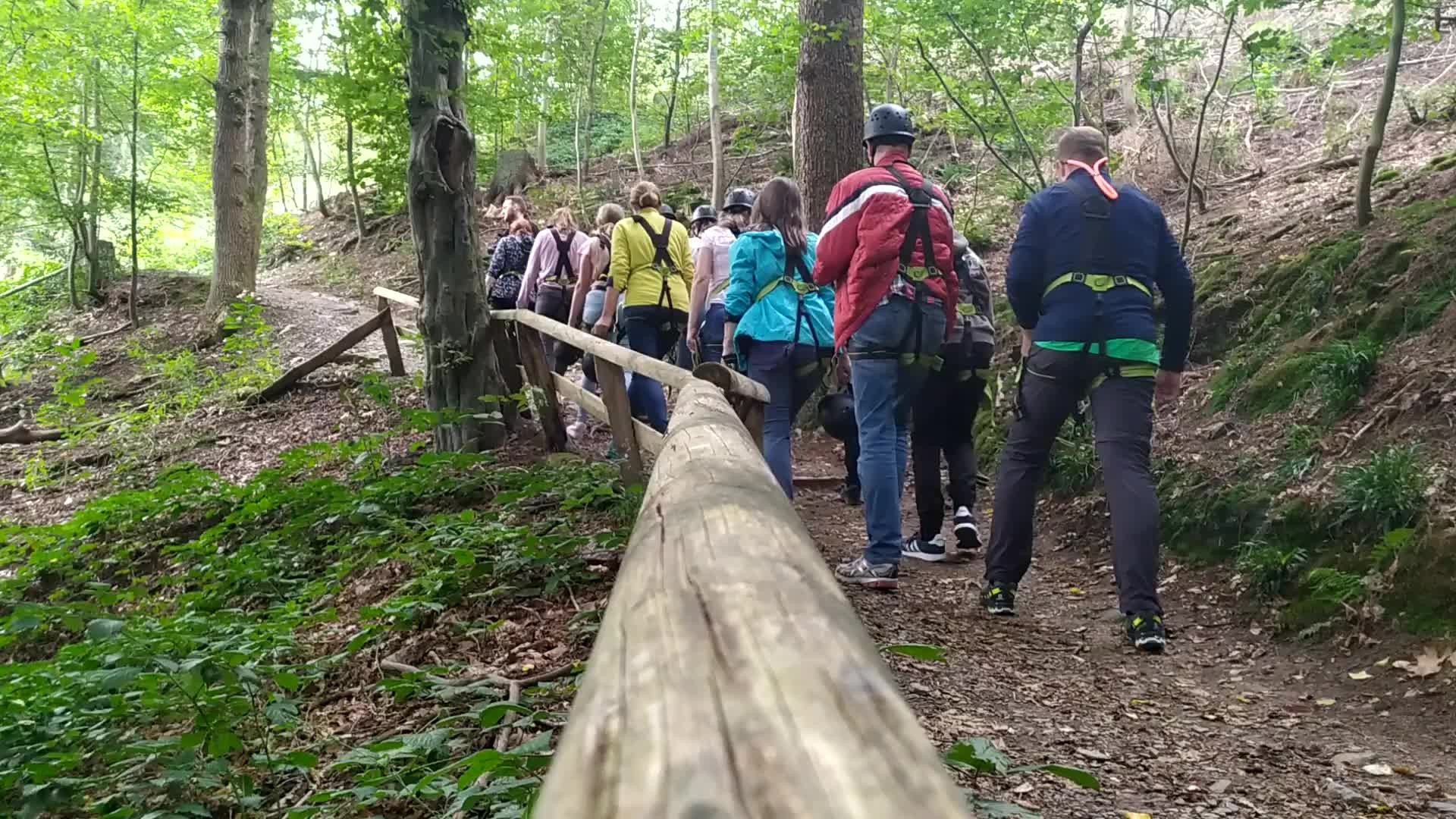 Jede*r Teilnehmer*in bekommt von ihm einen Klettergurt, einen Schutzhelm und ein Walkie-Talkie. Der nächste Schritt ist das eigenständige Anlegen der Ausrüstung im Freien. Schnell wird klar: So einfach, wie es beim Profi aussieht, ist es nicht. Helfende Hände sind nötig, damit alle Teile am Körper sitzen. Noch ein prüfender Blick, dann setzt sich der Menschenzug in Bewegung.