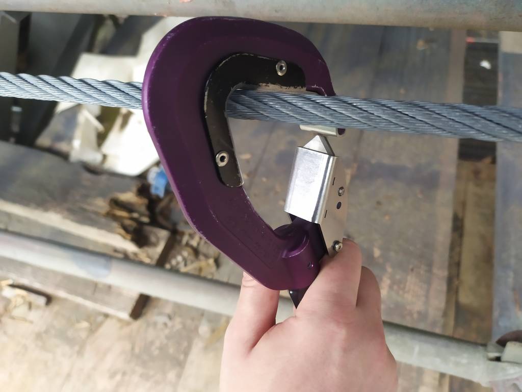 Schließlich lautet das Kommando „Einklinken!“ Der große lilafarbene Sicherungshaken, der mit dem Klettergurt verbunden ist, kommt über das befestigte Stahlseil, das ab jetzt den Weg an der Aufstiegstreppe vorgibt. Er wird nach und nach über schwarze Sicherungen und Bremsen geführt, die bei einem Fall Leben retten.