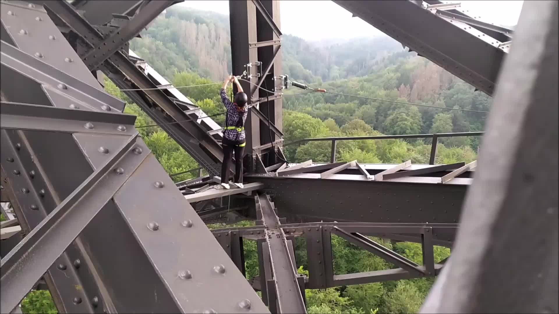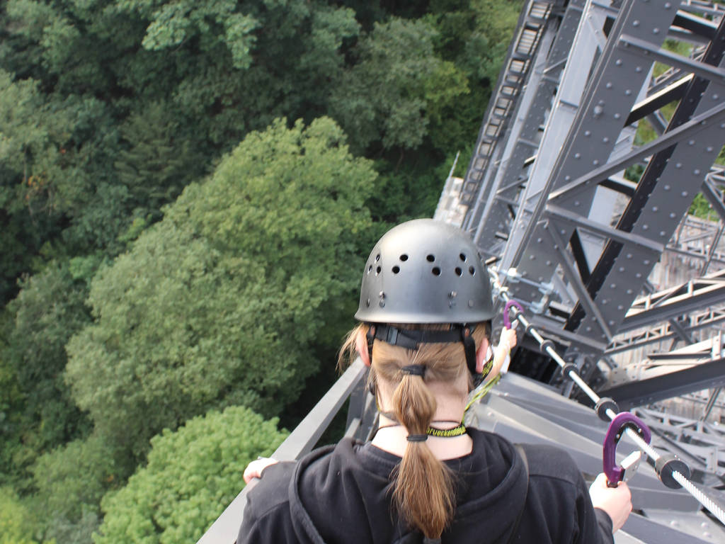 „Hallo, hallo! Könnt ihr mich alle gut verstehen? Wir nähern uns gleich dem höchsten Punkt des Brückenbogens. Kurz dahinter habt ihr die Wahl, ob ihr über einen fußbreiten Querbalken gehen möchtet. Alle können, keiner muss“, schallt es plötzlich aus dem Funkgerät. Die Entscheidung fällt an dieser Stelle leicht. Die ganze Gruppe zieht mit.