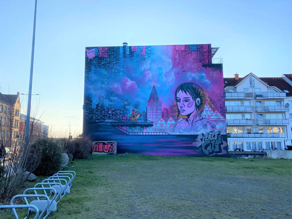 Schräg gegenüber vom Hauptbahnhof empfängt das größte Mural der Stadt die Paderborner*innen und ihre Gäste. Es entstand, wie viele Arbeiten auf der Tour, während des Secret City Fassadenfestivals 2021 von den Künstlern Henning Marten Feil alias Norbert 3000 aus Brilon und Volker Heisener und zeigt Paderborn im Jahr 3021. Heisener wurde für seine Verdienste um die Graffitikunst bereits mit der Kulturnadel Paderborns geehrt. „Man sieht: der Dom steht noch“, kommentiert Sven Niemann das Bild und erklärt, mit welcher Technik Graffitikünstler solch große Wände heute gestalten. Spraydosen reichen dafür nicht mehr aus.