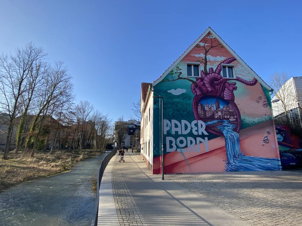 Mitten in der Altstadt entspringt die Pader. Aber nicht an einem Ort, das Wasser sprudelt an unzähligen Stellen aus der Erde. Das Paderquellgebiet gehört mit dem Dom und Schloss Neuhaus zu den drei klassischen Sehenswürdigkeiten der Stadt in Ostwestfalen. Seit 2018 wirbt sie auch mit ihren Graffiti und bindet Street Art in ihre Besucherprogramme ein.