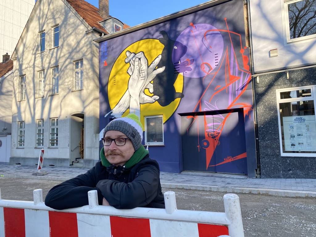 Wenn eine graue Mauer bunt wird, fällt sie ins Auge. Ob das Haus zu verkaufen sei, wurde er kürzlich gefragt. Dabei hat Lukas Michalski alias KA$H das Lagerhaus an der Westernmauer nur bemalt – eigentlich veredelt. Mit der Arbeit „Ménage à trois“. Sie verweist auf eines der Wahrzeichen Paderborns, das Dreihasenfenster im Dom. Ein (menschlicher) Hase versucht das Häschen zu bekommen. Aber? Es scheint schon vergeben zu sein…