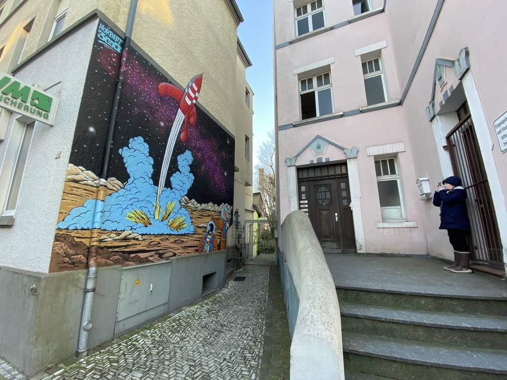 Wenn aus unscheinbaren Hausecken Kunstorte werden, könnten Graffiti im Spiel sein. Norbert 3000 hat sich von Hergés Tim-und-Struppi-Geschichte „Schritte auf dem Mond“ inspirieren lassen (und die Herausforderung des Fallrohrs erfolgreich gemeistert). Es gibt aber bei der Rakete an der Riemekestraße einen entscheidenden Unterschied zum Vorbild…