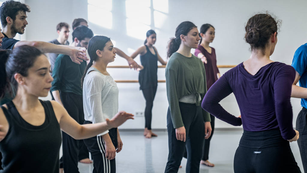Das Folkwang Tanzstudio bei der Probe zu „Neuer Neuer Neuer Tanz“ des belgischen Choreografen Michiel Vandevelde.