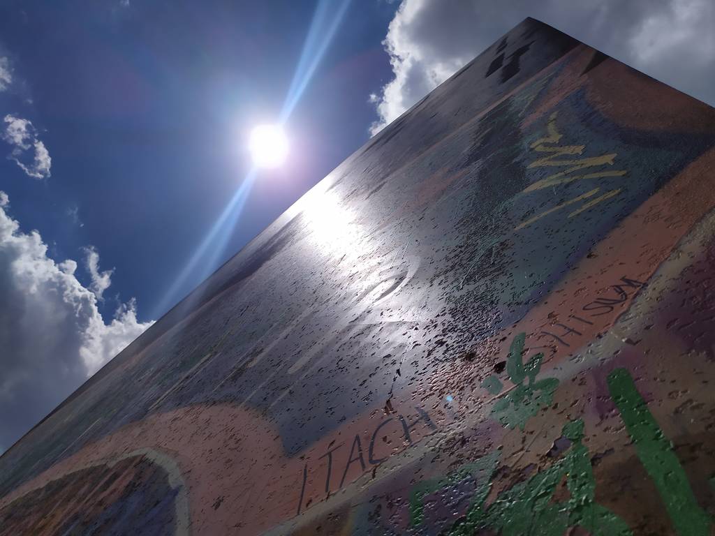 Das imposante Kunstwerk wirkt immer eindrucksvoller, je näher man kommt. Bald zeigt sich ein einmaliges Lichtspiel: Die bunten Graffiti auf der Oberfläche entfalten ihre Strahlkraft. Sie geben dem 67 Tonnen schweren und 14,5 Meter hohen Metallmonolithen den gewissen Charme. Die Bramme wurde bereits 1998 hier aufgestellt und genau nach den Himmelsrichtungen ausgerichtet.
