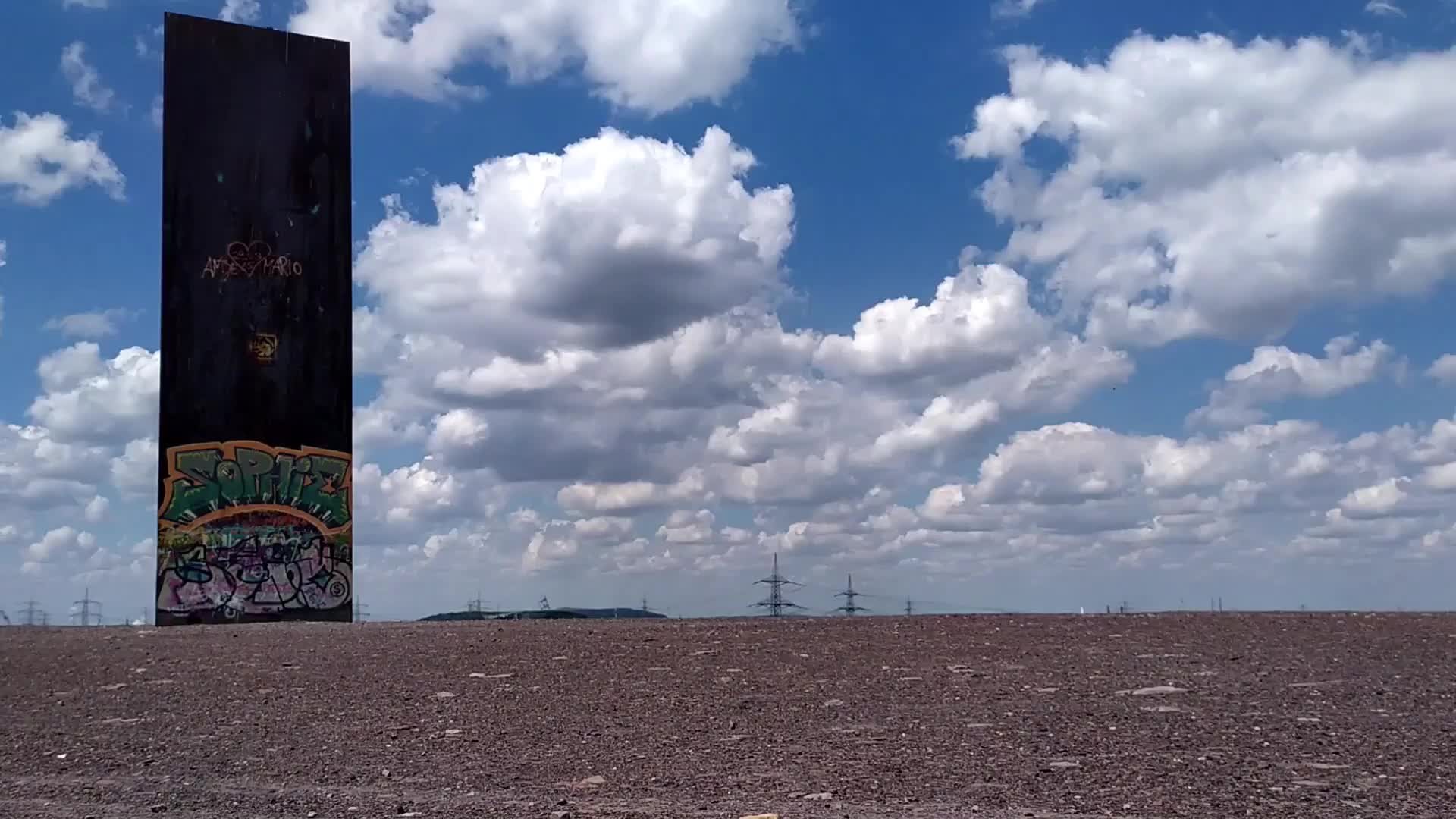 Wow! Oben angekommen entfaltet sich das volle Haldenpanorama. Die oberste dunkle Abraumschicht auf dem Plateau funkelt im Sonnenlicht. Sie gleicht einer Mondlandschaft. Darüber der blaue Himmel, rundherum lebendige Vegetation. Und am Horizont ein Koloss aus gegossenem Stahl: die wuchtige Landmarke des US-amerikanischen Bildhauers Richard Serra zieht alle Blicke auf sich. Dort geht es also hin: Zur Bramme für das Ruhrgebiet ...