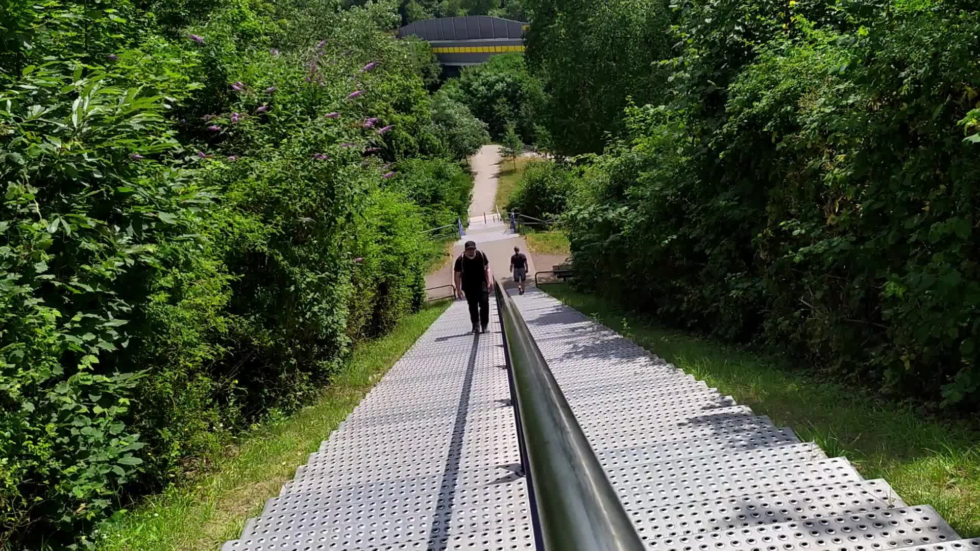 Der erste Abschnitt des rund 26 Kilometer langen Wanderweges ist bereits geschafft. Die Aussichten waren abwechslungsreich, die Eindrücke vielfältig. Nun wartet ein kurzer Aufstieg auf die 50 Meter hohe Schurenbachhalde, ein Höhepunkt der Tour. Treppenstufen im Osten führen auf den renaturierten Abraumberg, den die Zeche Zollverein noch bis zu ihrer Stilllegung im Jahr 1986 zur Lagerung von Bergematerial nutzte.